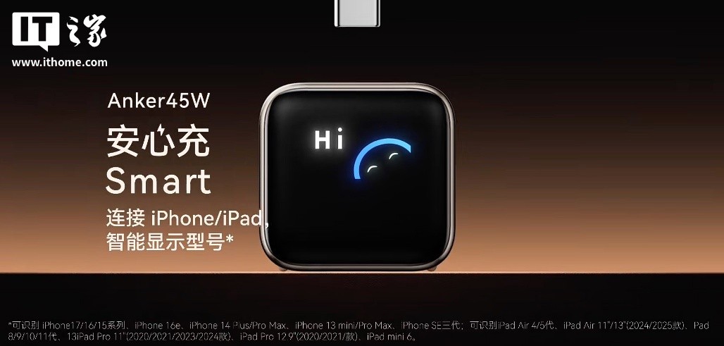 重点是,这玩意儿还有一块屏幕!连接 iPhone 和 iPad时,屏幕能显示型号信息,可不只是个花哨的装饰。屏幕上还能根据电量状态调整充电功率,聪明得不像充电头,特别是它有个“护机充电”模式。咋用?双击切换就行。据说这个模式可以减少电池衰减,对吧,这简直反人类充电哲学了。
