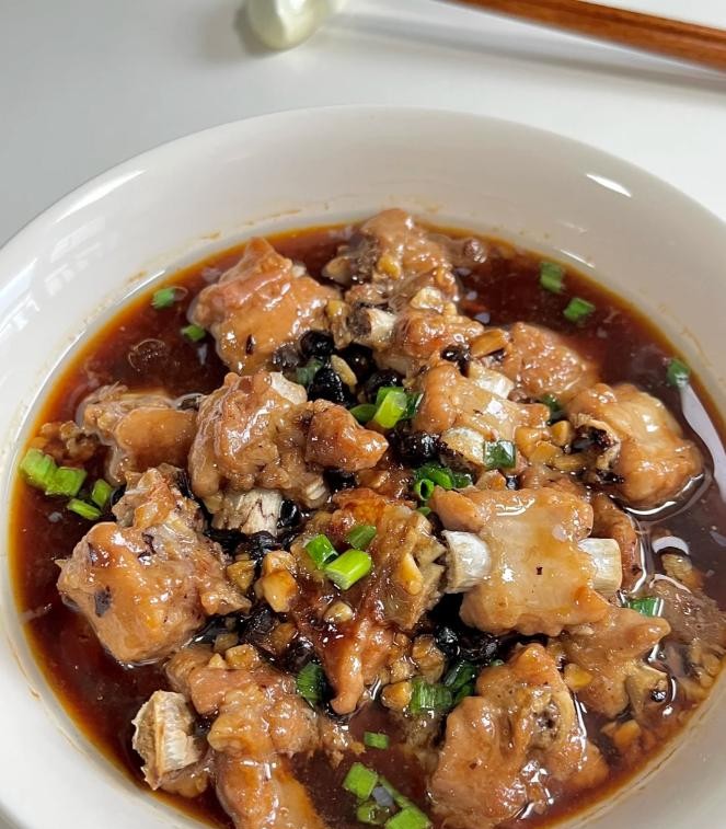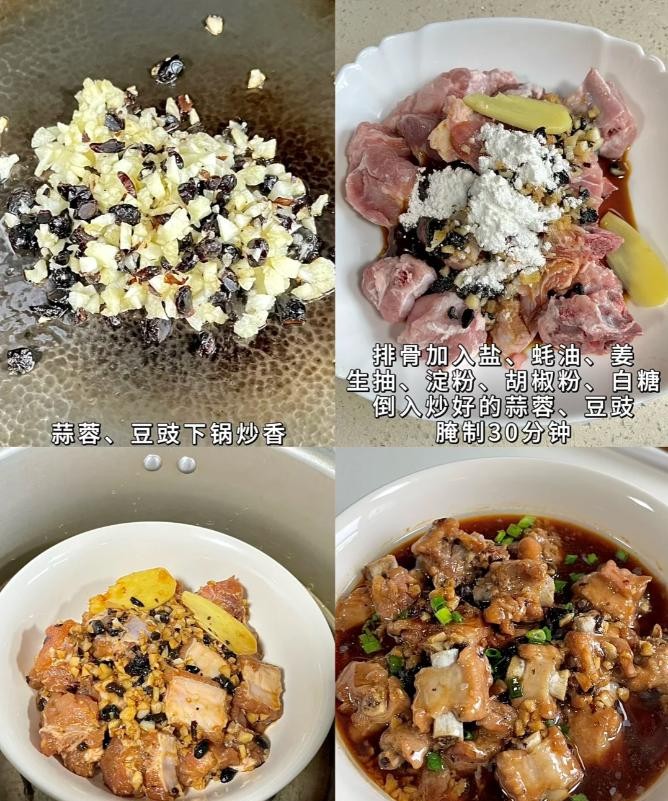 还有蒸排骨,这可在饭馆点菜榜上排名前列。排骨提前腌湿,大蒜末和豆豉是灵魂,再撒点胡椒粉和葱花,包盘上锅蒸。不需要太多技巧,就靠材料和火候,结果老少咸宜。