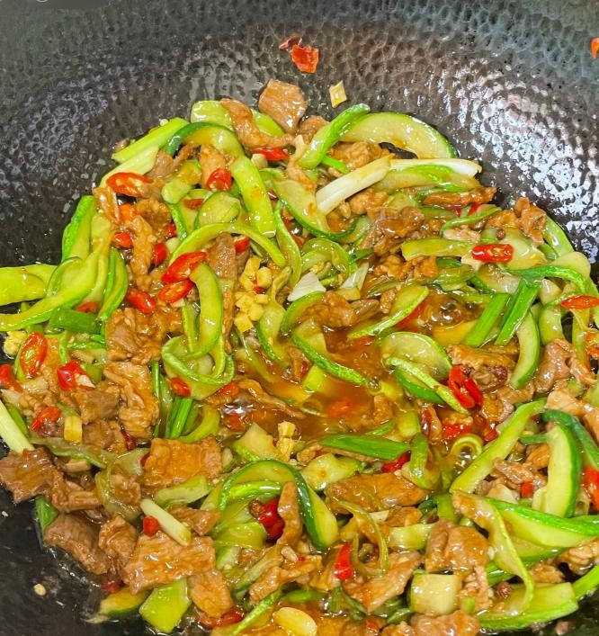 接下来,黄瓜炒肉。这道菜我最爱,清爽还带点热辣。黄瓜切片扔热油里,猪肉末炒香,小米辣来加深风味层次。真的,你试一次就知道它有多适合家里做。